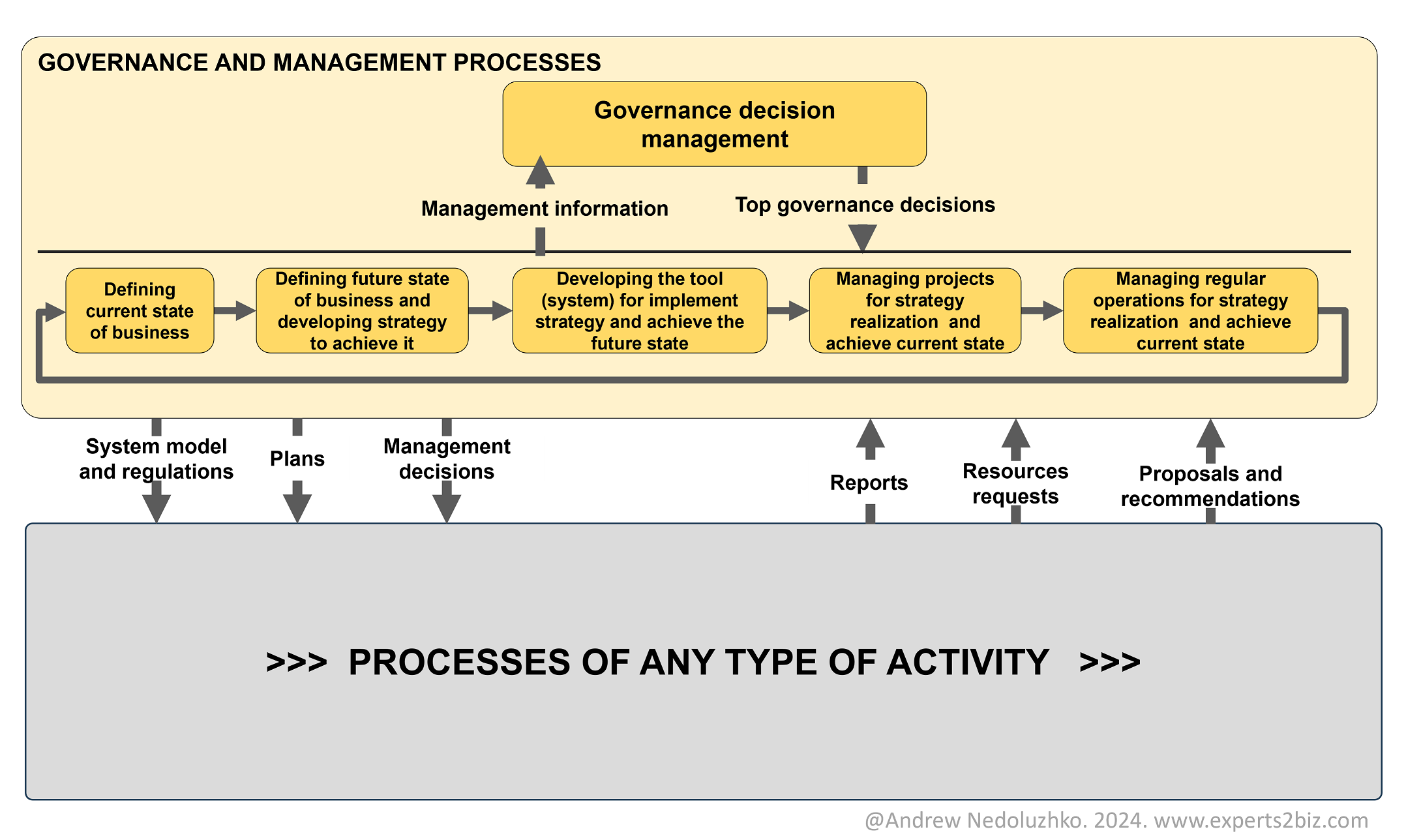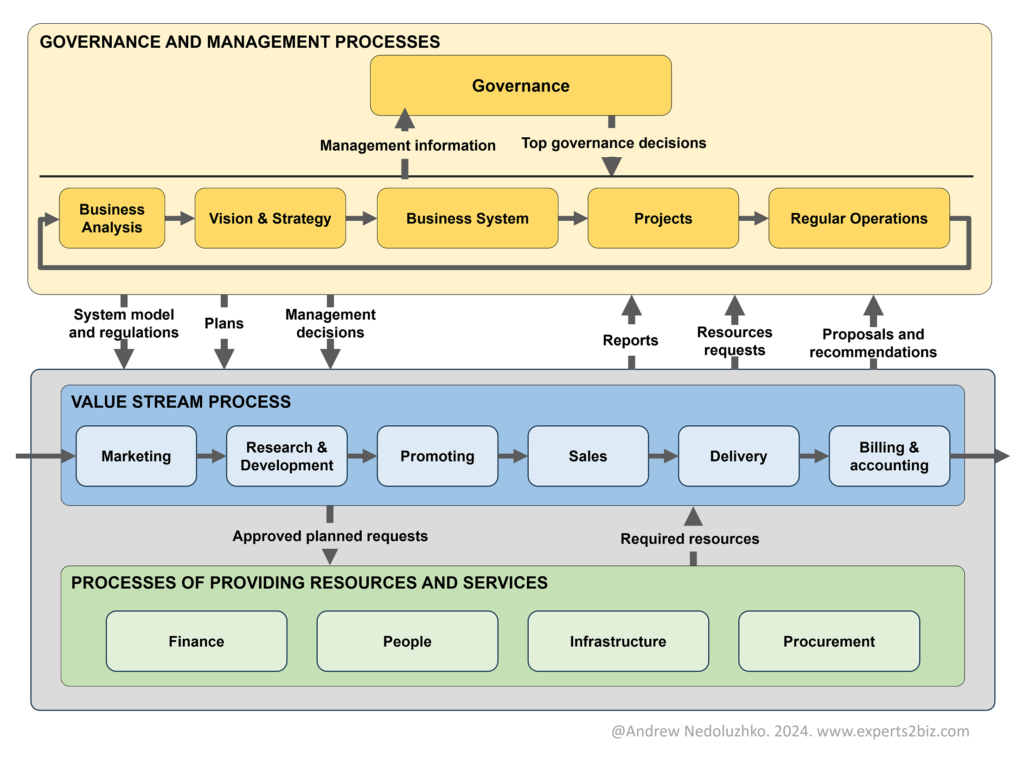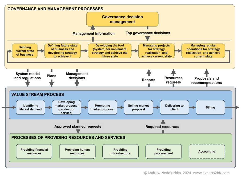 - Governance Decision Management – the pinnacle of the business system: a process of senior business leadership where the highest management decisions are prepared, made, and their execution is monitored.