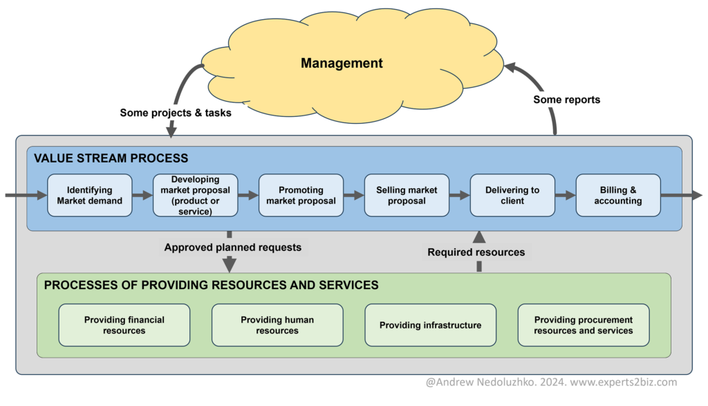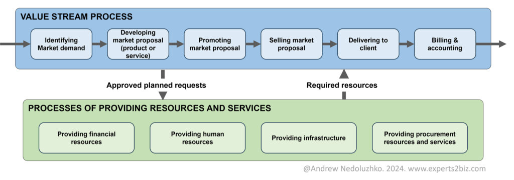 High-level – at the initial stage, in order to build and use the system, we need the top level of the process model to see how the company creates value, provides resources, and manages the business without delving into details (details will be addressed in the following steps).
