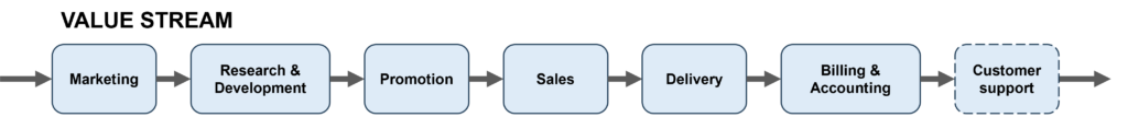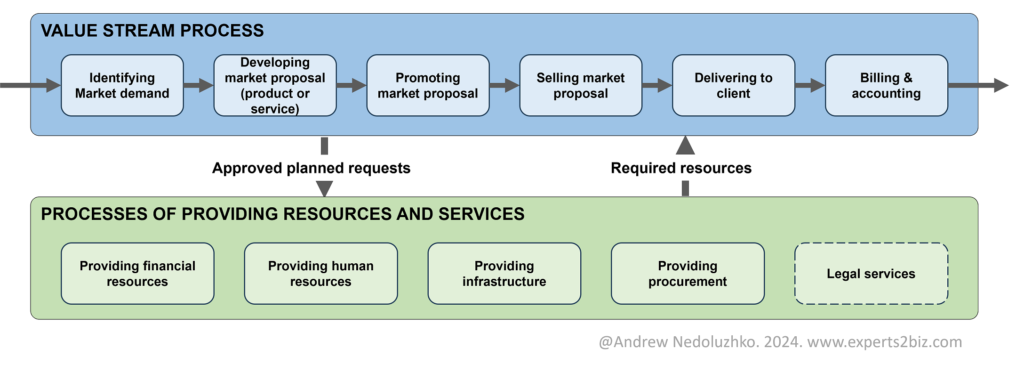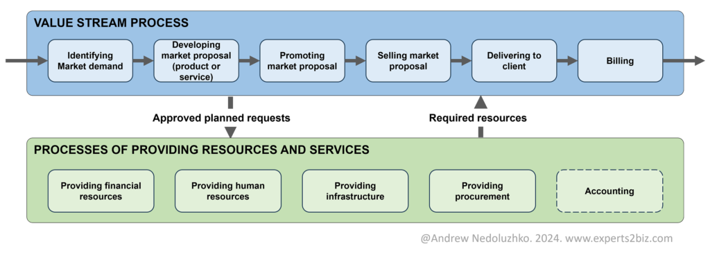 And sometimes, even parts of the value stream process can be moved to the provisioning process or outsourced through procurement. For example, the figure below shows that accounting is moved to a separate supporting process.
