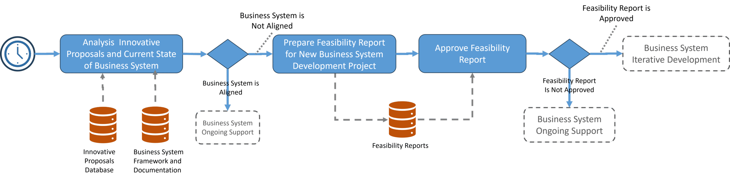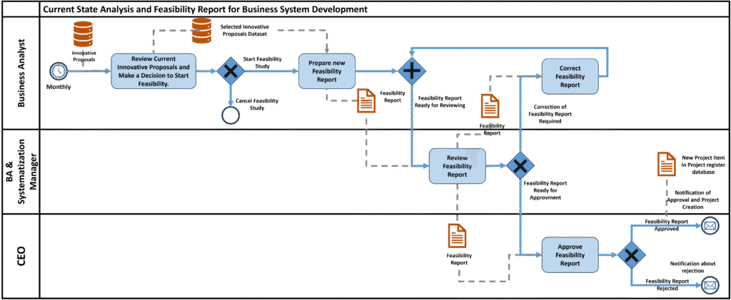 - After reviewing the Feasibility Report, the BA & Systematization Manager makes a decision: either ‘Feasibility Report Ready for Approval’ or ‘Correction of Feasibility Report Required’: