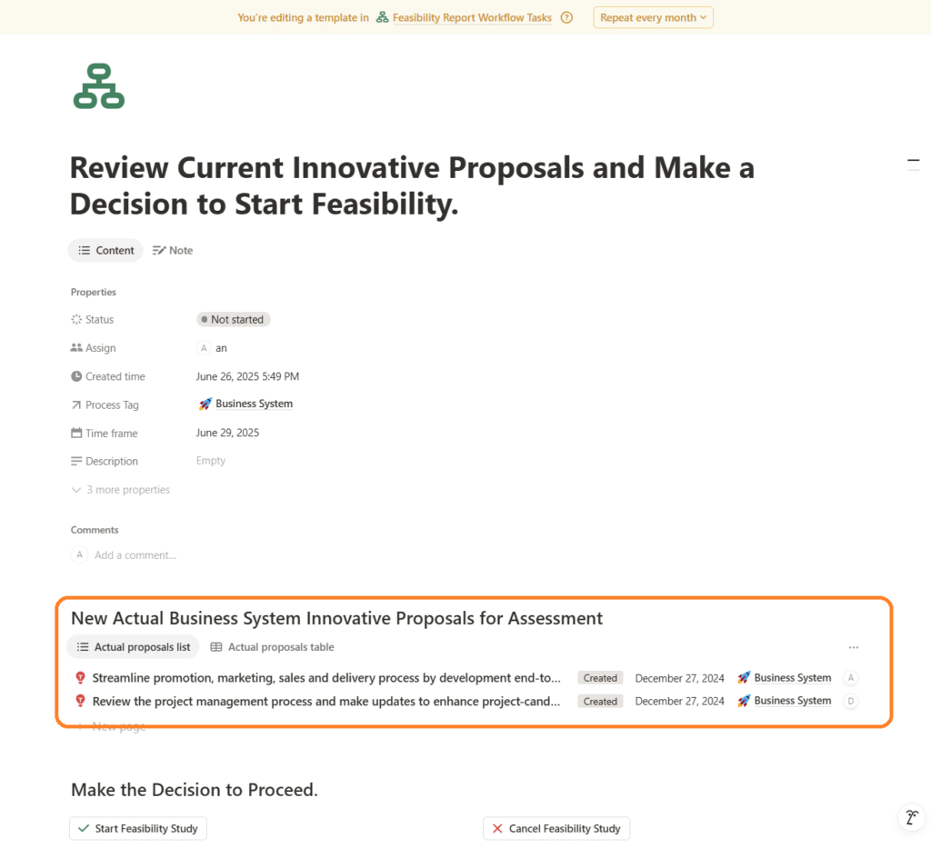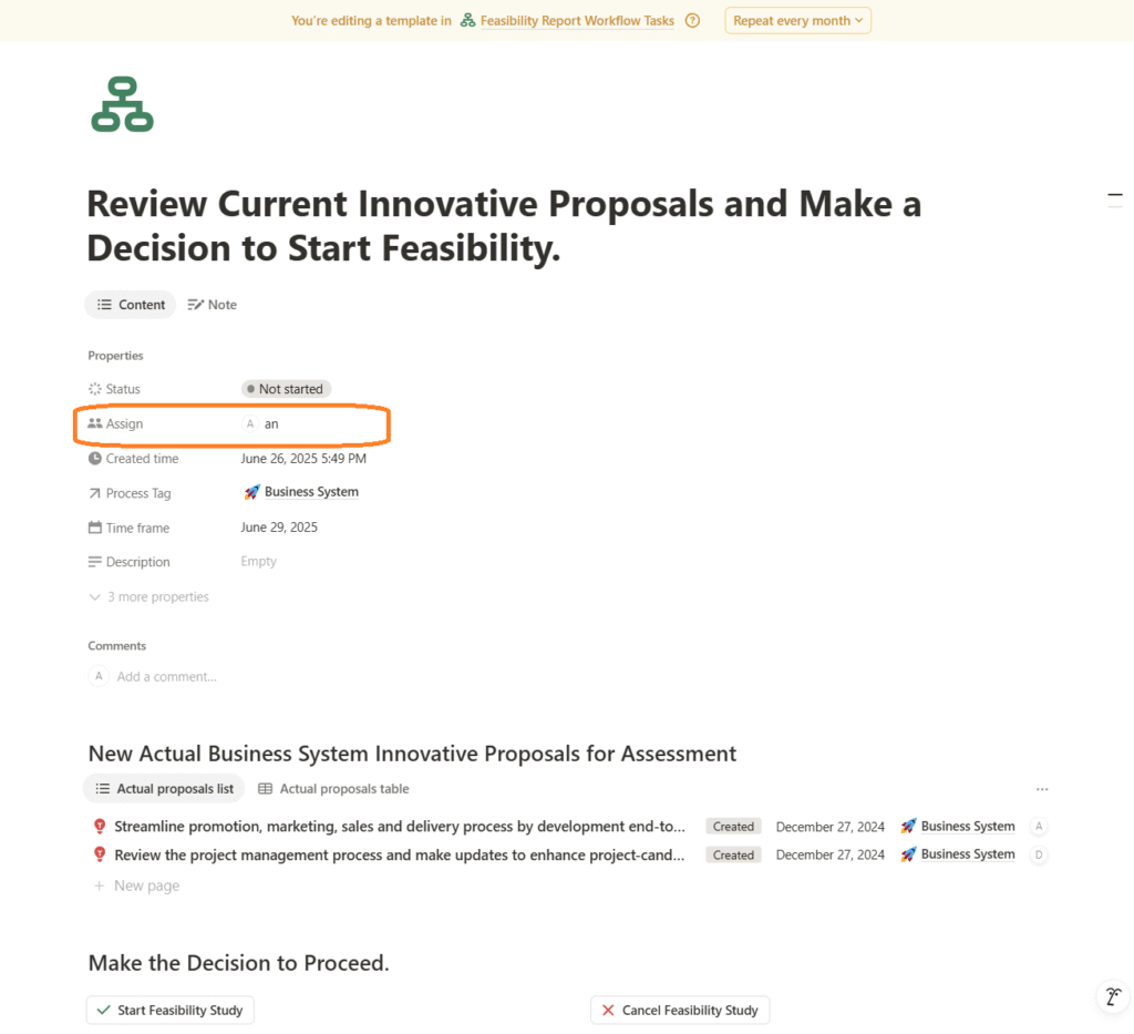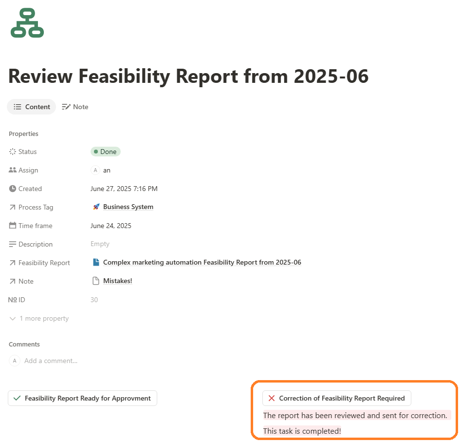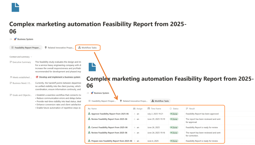 - If the Business Analyst chooses the ‘Start Feasibility Study’ decision, the workflow generates a new task—’Prepare New Feasibility Report’—for the Business Analyst. To minimize manual work, the workflow also creates a new Feasibility Study document in the corresponding database table with the default status ‘In Preparation’ and opens it directly in the Notion window, allowing the analyst to begin working on the report immediately