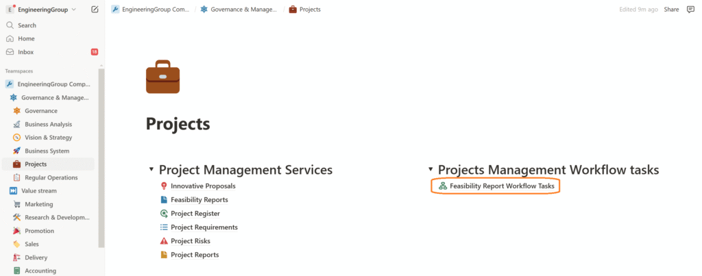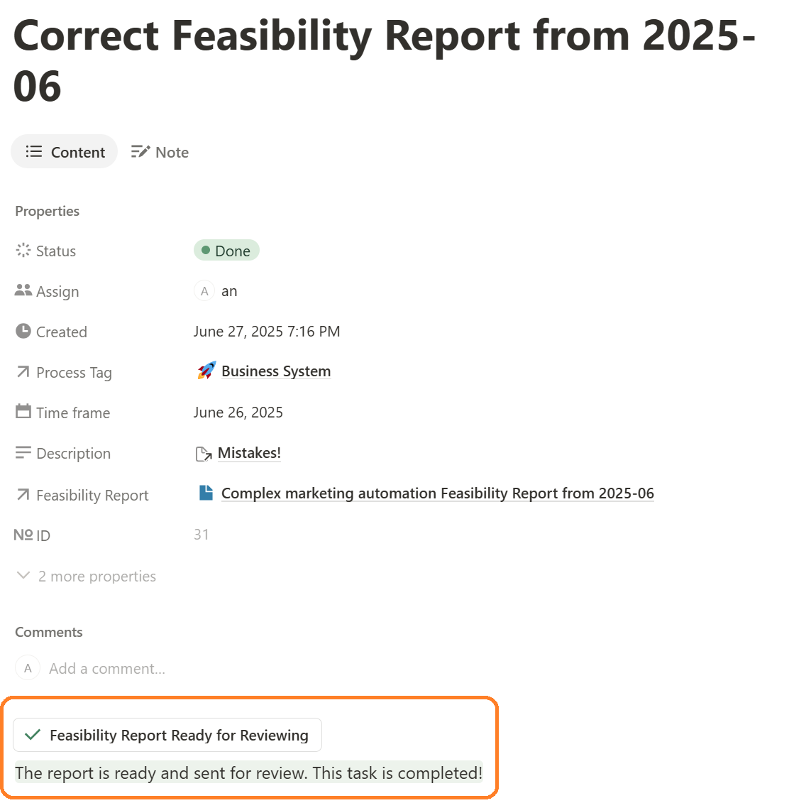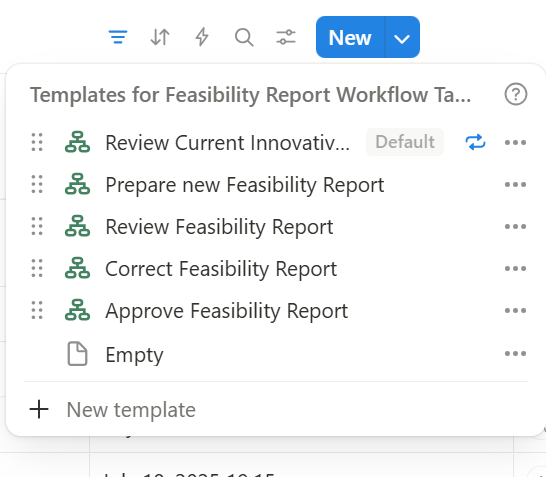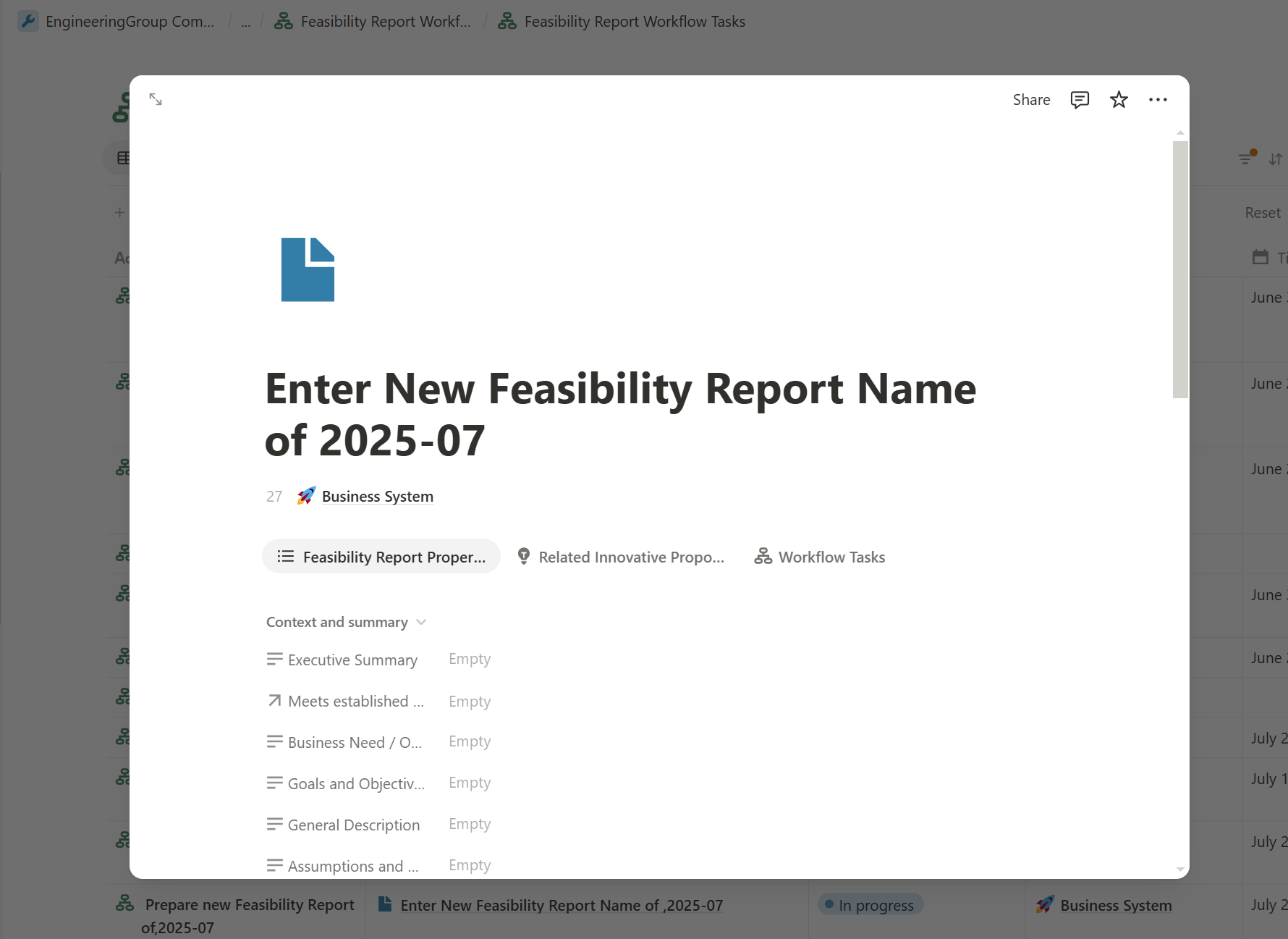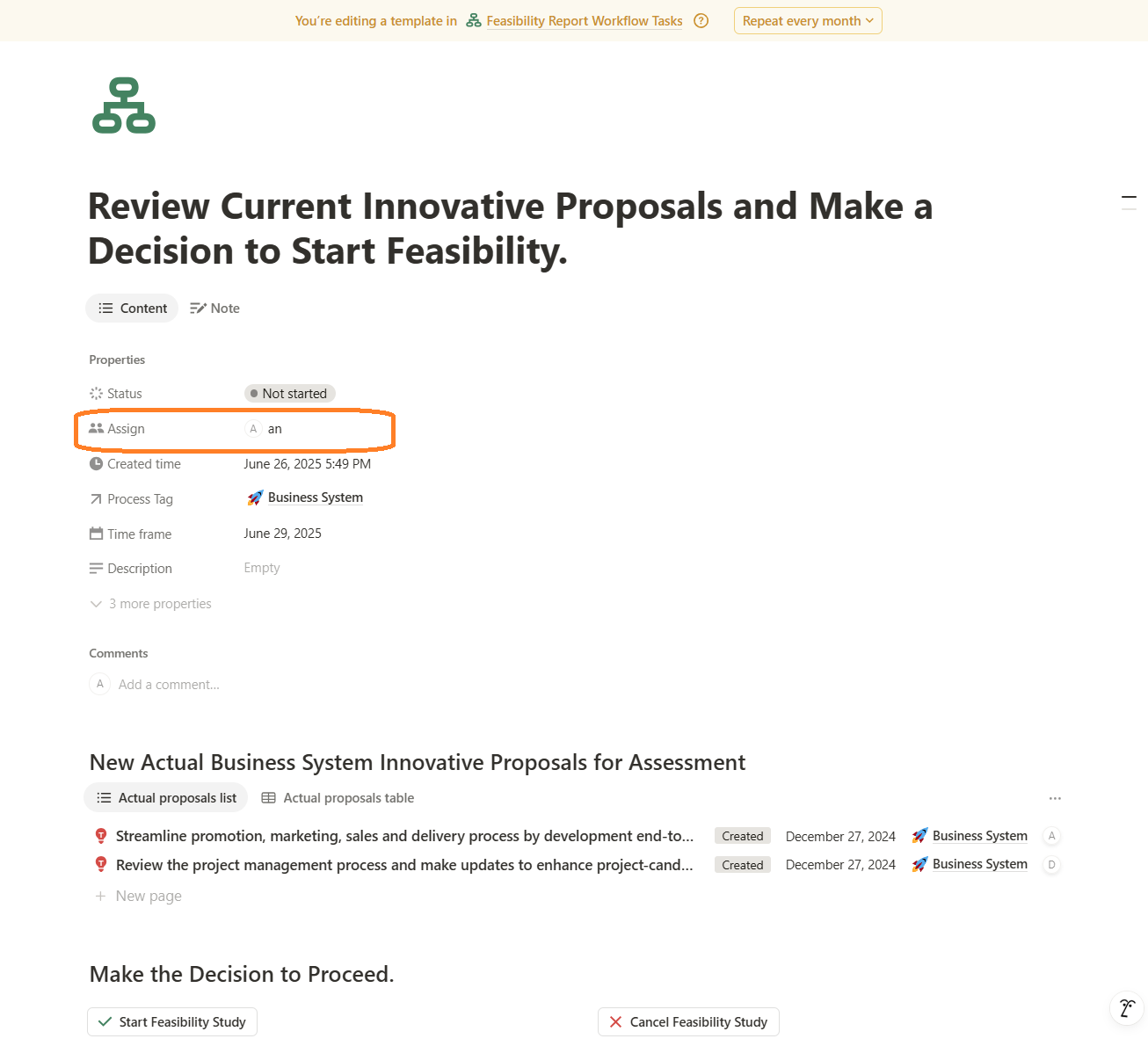 - If the Business Analyst chooses the ‘Start Feasibility Study’ decision, the workflow generates a new task—’Prepare New Feasibility Report’—for the Business Analyst. To minimize manual work, the workflow also creates a new Feasibility Study document in the corresponding database table with the default status ‘In Preparation’ and opens it directly in the Notion window, allowing the analyst to begin working on the report immediately