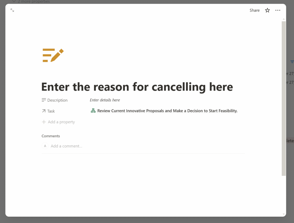 If the user chooses the opposite decision — ‘Cancel Feasibility Study’ — the workflow logic automatically generates a notes form to capture the reason behind the cancellation