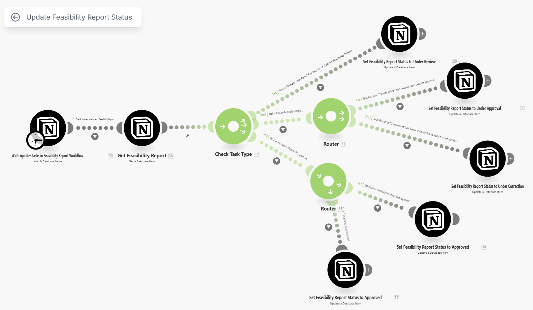 Another important feature that an automated workflow should include is automatic status updates for the processing object. In our case, the processing object is a Feasibility Report, which can have the following statuses: In Preparation, Under Review, Under Correction, Under Approval, Approved, and Rejected. Ideally, the status of the Feasibility Report should change automatically when a user completes a task and the configured Notion automations assign the next task or mark the workflow as complete. However, Notion automations do not allow this. This is where Make.com becomes very useful. We can easily create a Make.com scenario that monitors the results of workflow tasks and updates the Feasibility Report’s status accordingly.