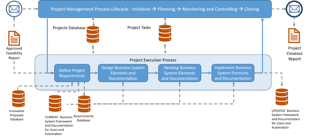 - Project Execution Process: which involves the sequential steps of Defining Requirements, Designing Business System Elements and the structure of necessary documents, Developing Business System Elements and documents, and Implementation.