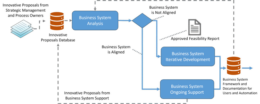 - Innovative proposals are collected in a database table and, at a set interval—monthly, quarterly, or semi-annually—these proposals are reviewed. It is possible that there are no proposals at all, or too few and too minor to justify a system-development project. In that case, we simply continue supporting the current version of the business system.