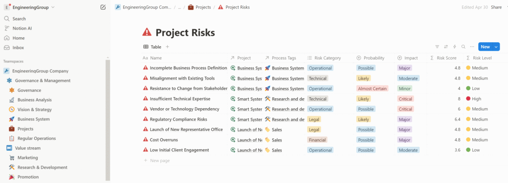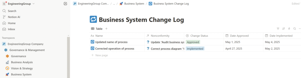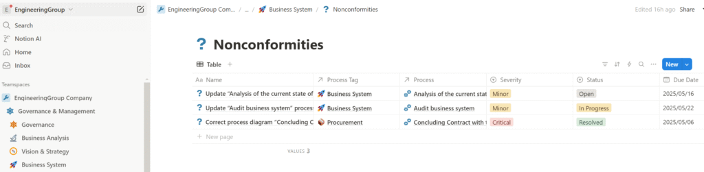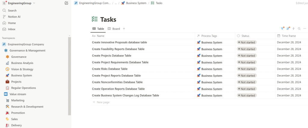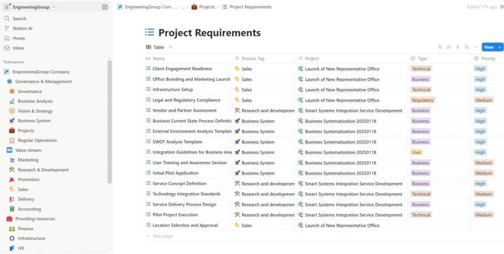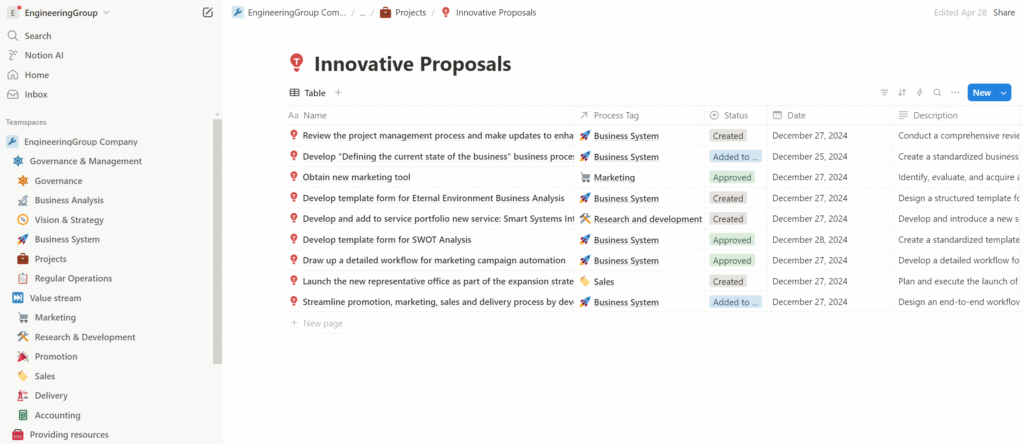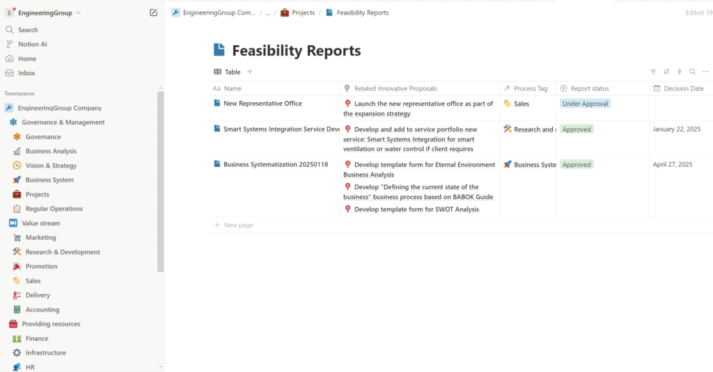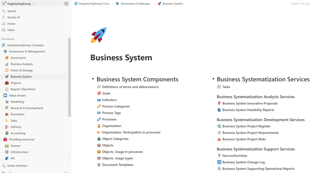 The output of the process is the business system framework in the form of Notion databases containing elements of the business system, the development of which was presented in the previous article, along with supporting documentation in the form of various regulations, procedures, or instructions. This documentation elaborates on the framework and can be stored directly in the corresponding database records. For example, we can store instructions in the description of a particular process, or a brief draft of a roadmap in the record of a specific goal, and so on. The structure and documentation of the business system are also used to ensure the correct execution and automation of all business and control processes—so we can make sure that all our processes are properly configured and functioning, and that any nonconformities identified are either resolved immediately or formalized as innovative proposals to be implemented in future iterations of business system development.