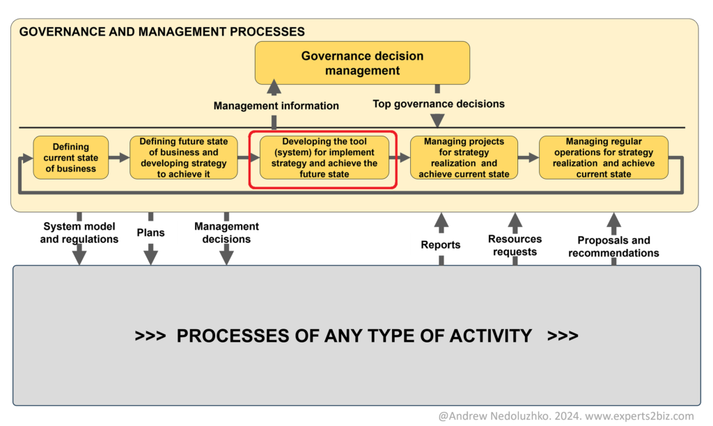 Now let’s examine the internal structure of the process “Developing the tool (business system) for implementing strategy and achieving the future state.” When we look at this process as the life cycle of a business system, we can distinguish four categories of activities or tasks that must be performed to achieve optimal results. This approach allows for a more structured and effective design of the business process. These categories include: