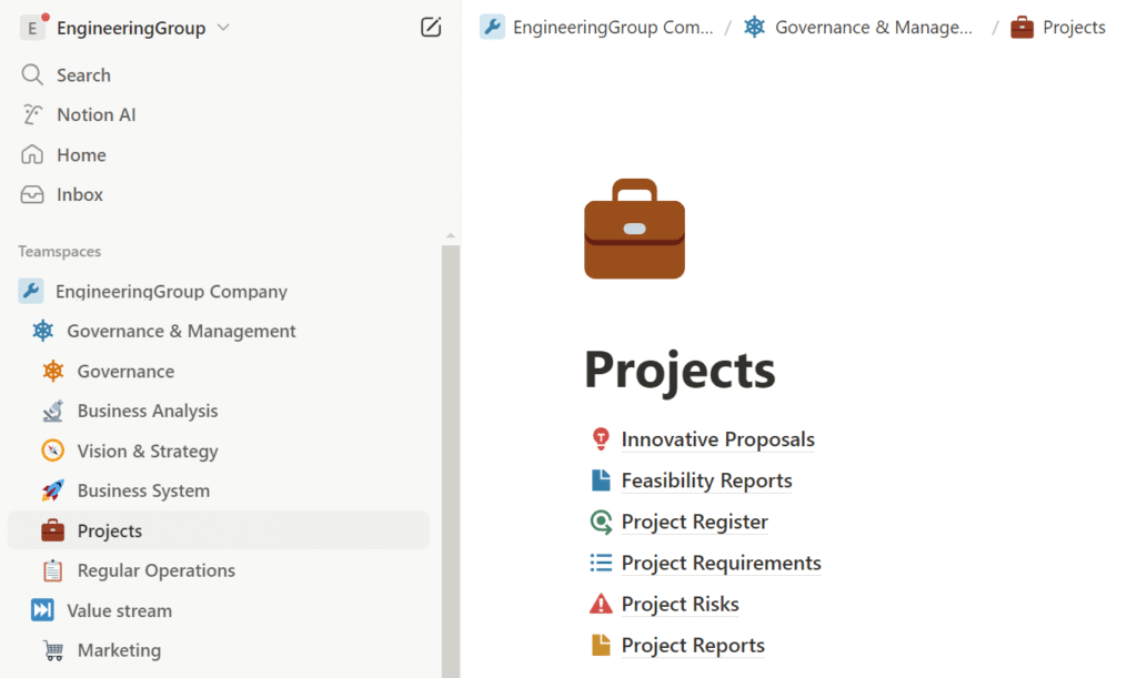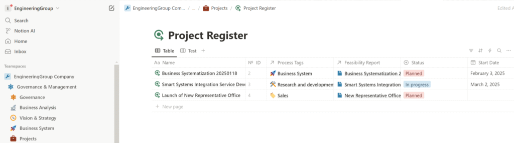 Additionally, we have developed a set of project management tools designed to support not only systematization but the entire business. Unlike the business systematization tools placed in the ‘Business System’ section of the Notion workspace, project management tools are placed in the ‘Projects’ section according to the business process model.