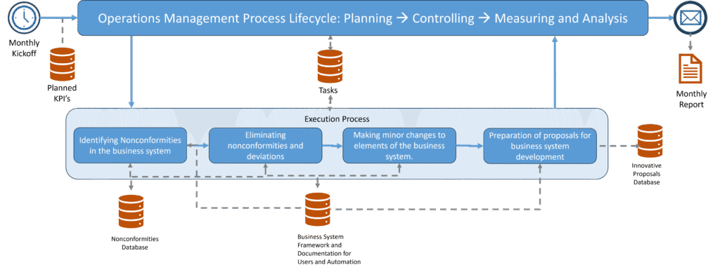 - Regular operations. This involves maintaining the current state of the system, which includes identifying and resolving nonconformities and deviations, making minor updates to the framework and documentation of the business system, or preparing innovative proposals for further development.
